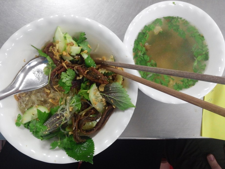 After a good night’s rest, we set off the next morning to find breakfast in the old quarter. We found a busy shop selling what we thought was pho, but they pointed to a photo menu that had our only choices for ordering and we pointed at things to just get something. Thom ended up with some sort of eel soup, and I had glass noodles with I think deep fried eel.