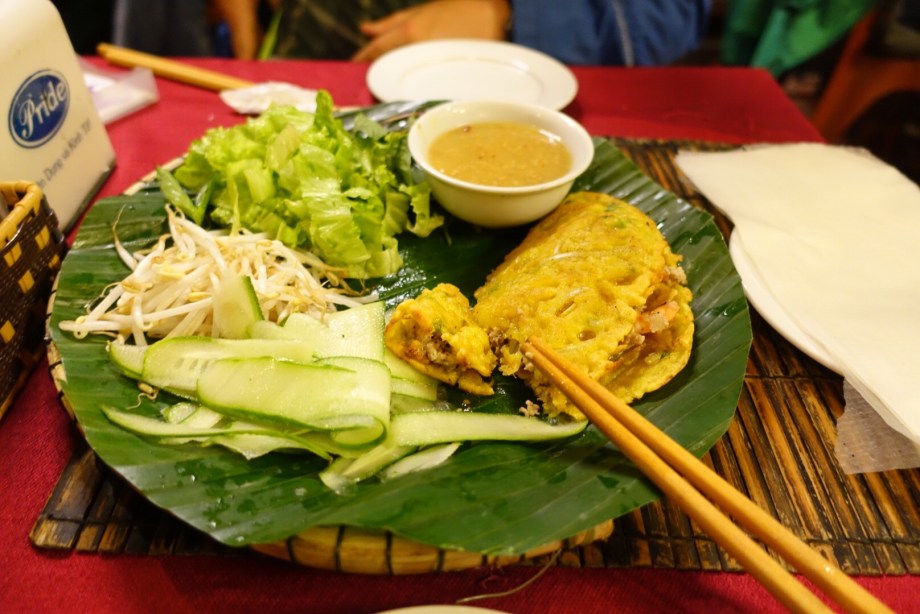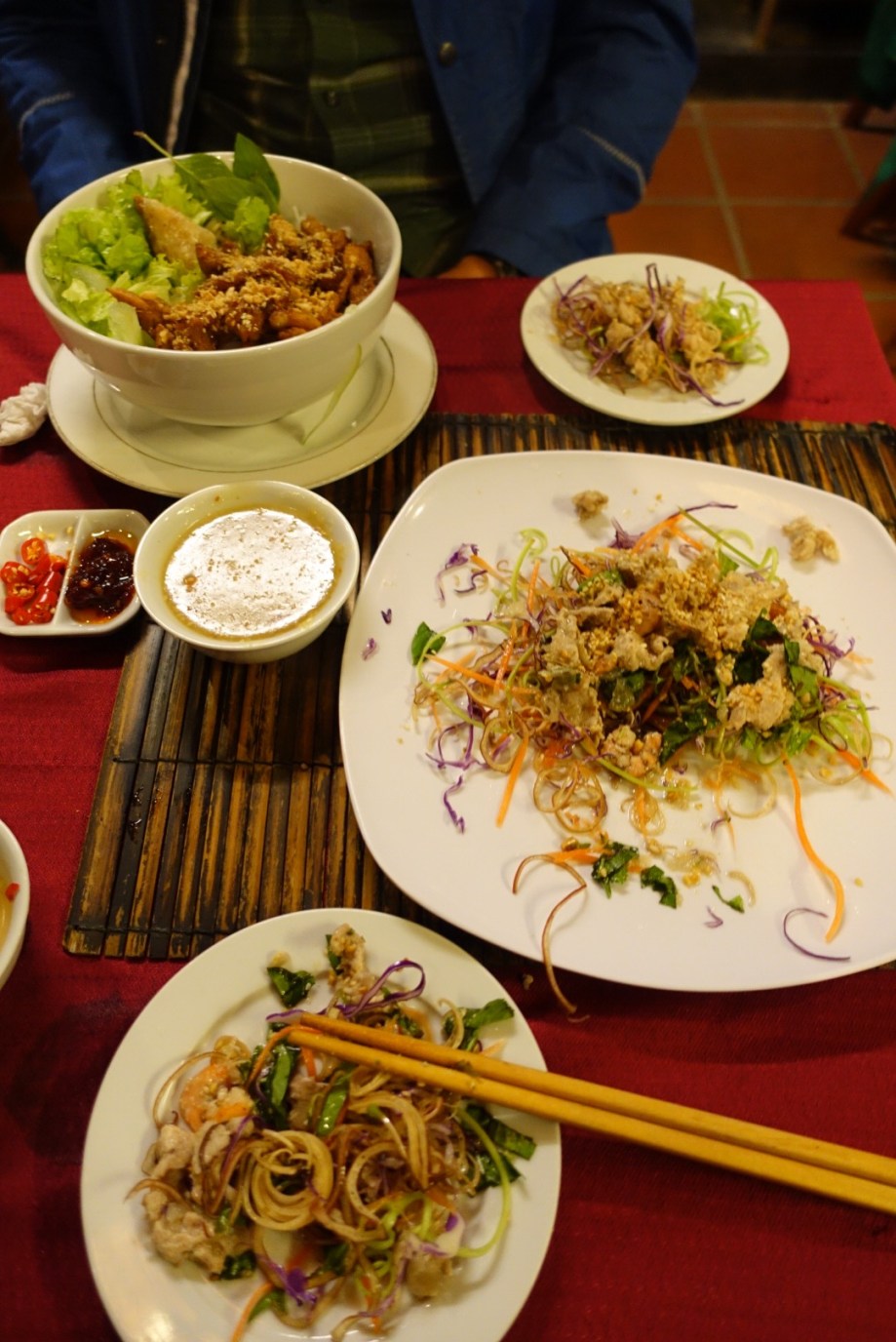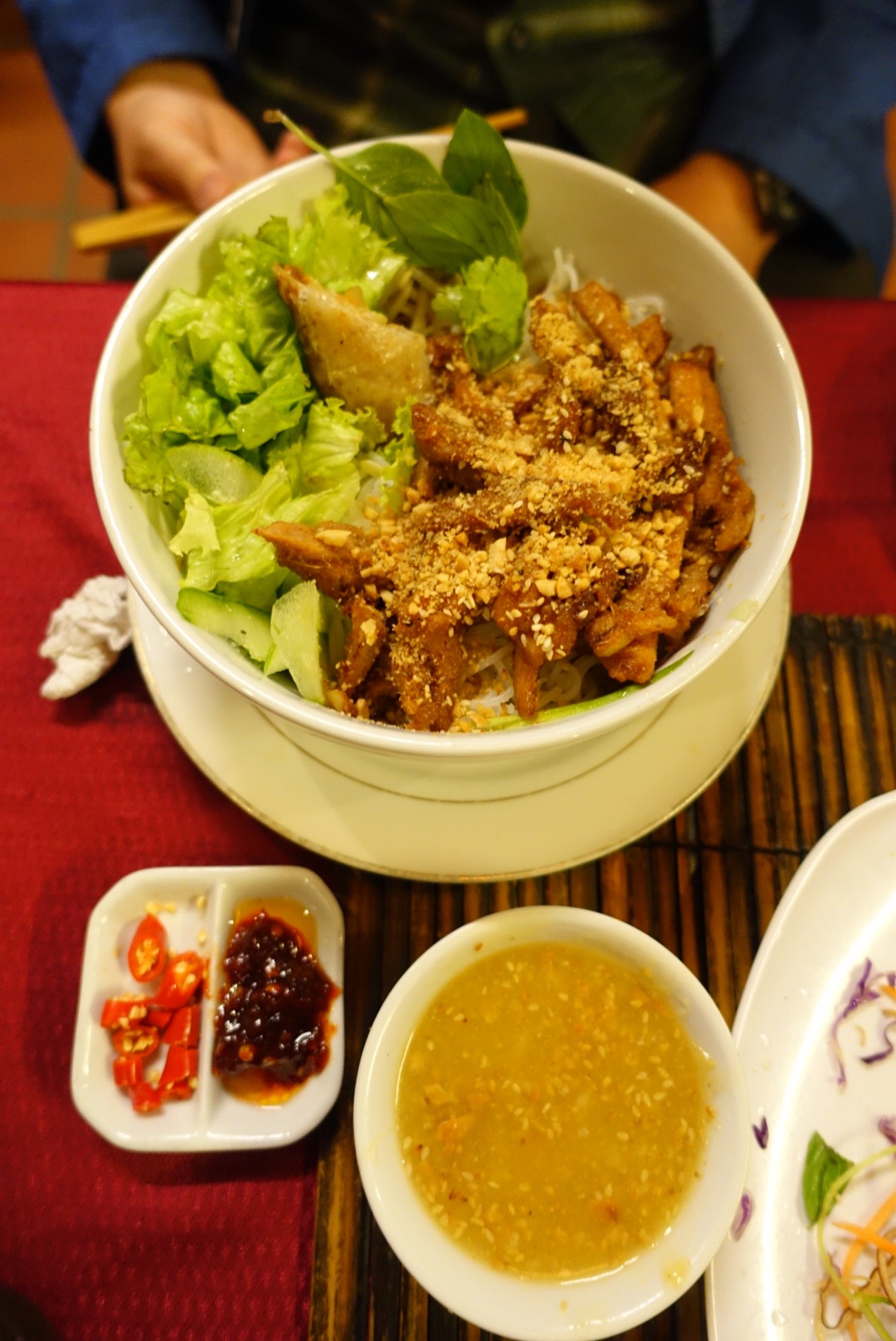 We ate at the same cafe for dinner twice in Hue because the food was so good, and they had a delicious sampling of central Vietnamese foods. My favorite was bun thit nuong, a bowl of rice noodles, lettuce, herbs, bean sprouts, grilled marinated pork strips, and spring roll, mixed together with a peanut sesame sauce. I could eat this every day!