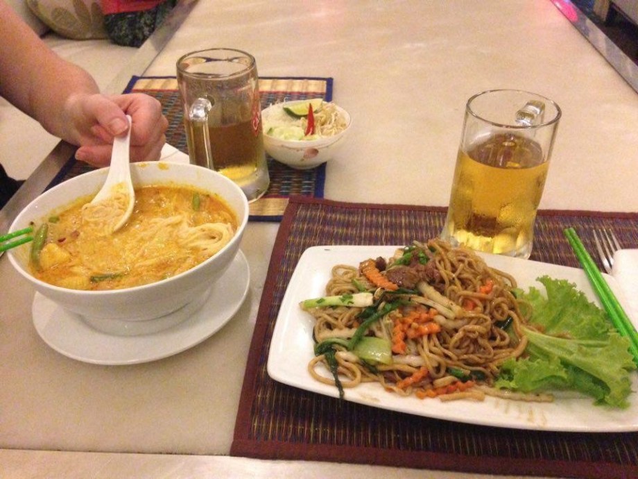 We took a bus from Ho Chi Minh City to get across the border to Cambodia and to our destination of the day, Phnom Penh, the capital of the kingdom of Cambodia. The supposedly 6 hour bus ride became an 8.5 hour ride, our first introduction to “Cambodian time”. It was a little weird crossing a land border into a developing country, as we had to turn our passports in to our bus driver who took them to immigration while we waited in a weird empty warehouse, but everything went fairly smoothly and we got to our hotel before it got too dark. We set out to find some cheap food for dinner, and after pouring through a website of cheap meals in Phnom Penh, we found a noodle restaurant nearby for dinner. It was still more than $10 for our meal, which compared to the prices we had seen in Vietnam, was fairly expensive for what we got. We got a delicious fried noodle dish and a noodle curry of sorts.