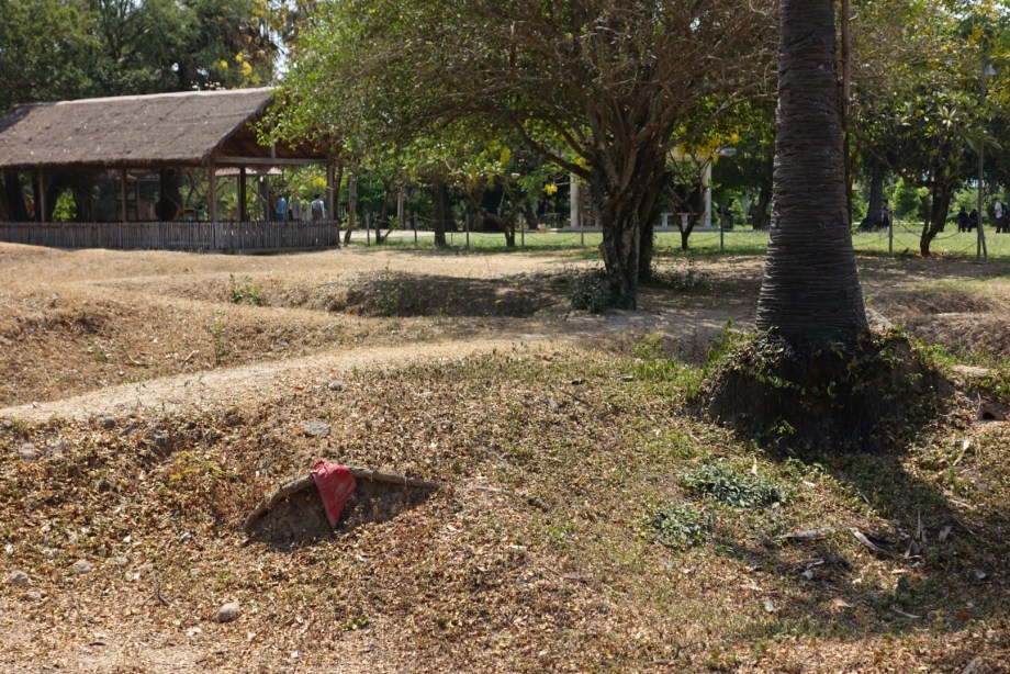We went out to the killing fields first, about a 30 minute tuk tuk ride out of the city. This site was particularly difficult to deal with, because many bones and pieces of old clothing have risen to the top of the soil throughout the fields, due to the hasty burials and the Cambodian rainy seasons washing away the dirt around them. The caretakers take the loose bones and clothes and put them in a shrine of sorts several times per year, but many are still partially buried and visible from the walkways. It is still very real.