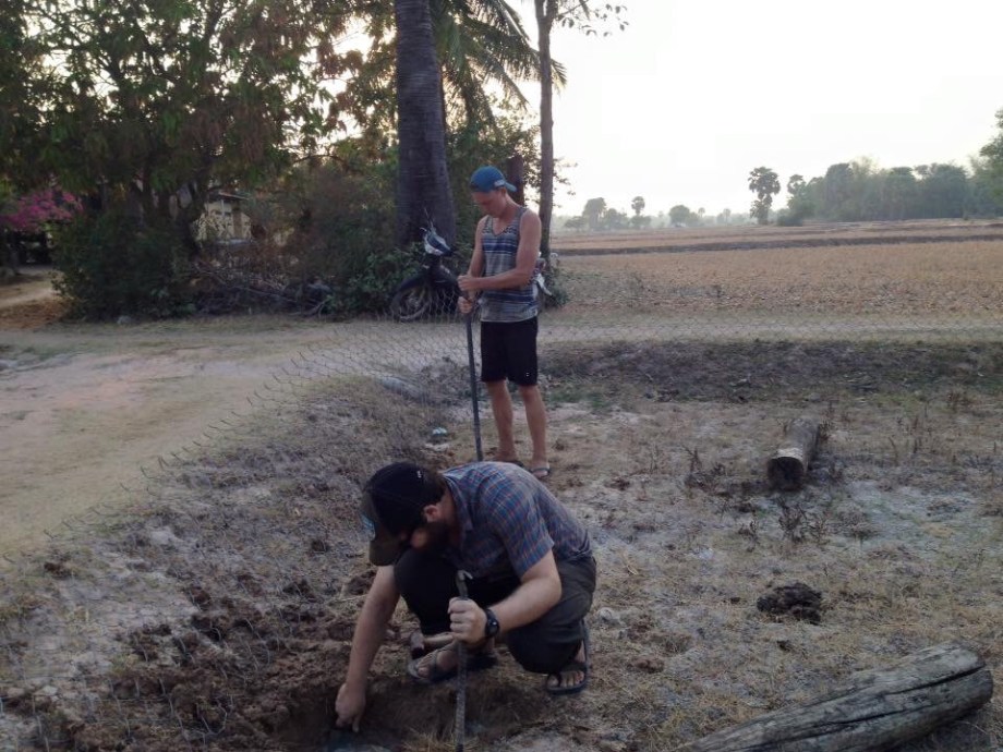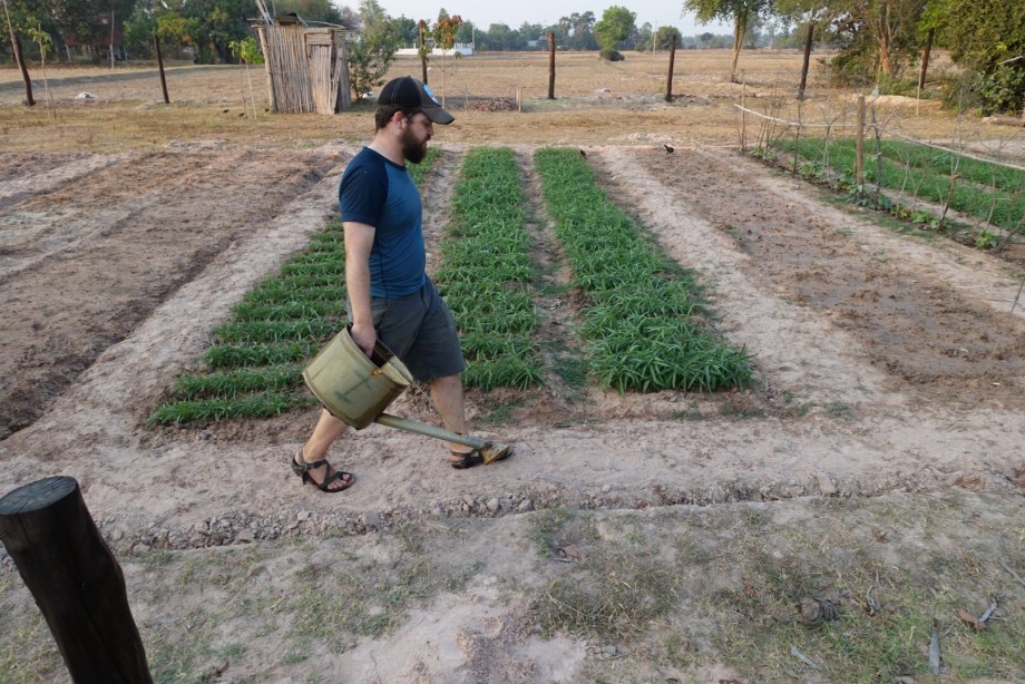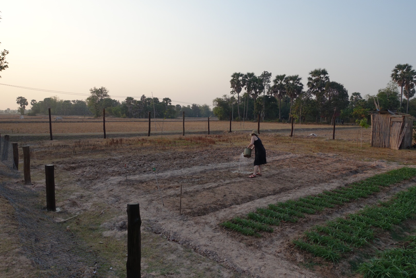 Watering the garden was a difficult task. At home, we take hoses and running water for granted, but here in the Cambodian countryside it takes a lot more work to do the watering. We had to pull buckets of water out of a maybe 30 foot deep well, fill giant watering cans with the water, then carry these cans all over the garden to water the plants. It took 4 people about an hour and a half to do this task daily!