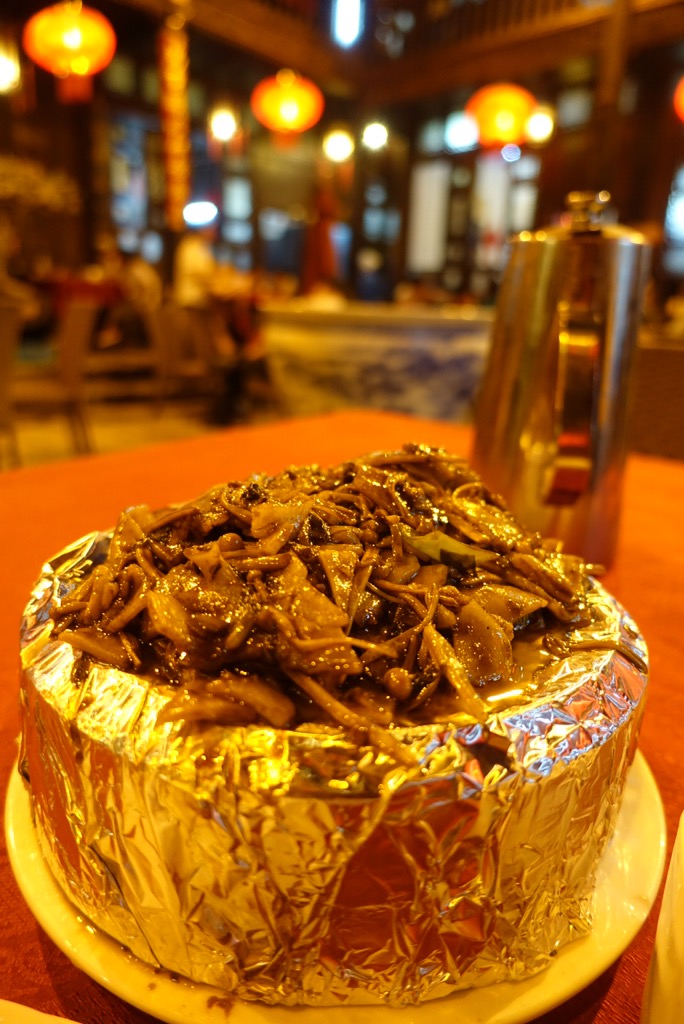 It turned out to be called Laofangzi. The staff didn’t speak English, but the menu had pictures, and we waited for a bit for a table so we had a chance to see what everyone else was eating. We chose something on a foil hot plate of sorts, because a ton of people were eating it, and also some sort of meat dish. We had no idea what they were when we ordered them, but they looked good.