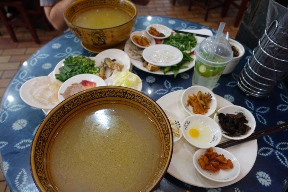 That evening, we decided to try to find the dish we were supposed to eat in Kunming, Cross the Bridge Soup. The story goes, that a woman’s husband was working as a professor a distance away from their home, and the woman would bring him lunch every day. But by the time she got over the bridge to where he was working, the soup would be cold and the ingredients overcooked. So she created this dish, where the soup had a layer of oil on top to keep the broth hot, and the ingredients would be added right before eating so they would be fresh. That way, when she got the dish over the bridge to her husband, he could assemble his lunch and it would taste good, hot, and fresh.