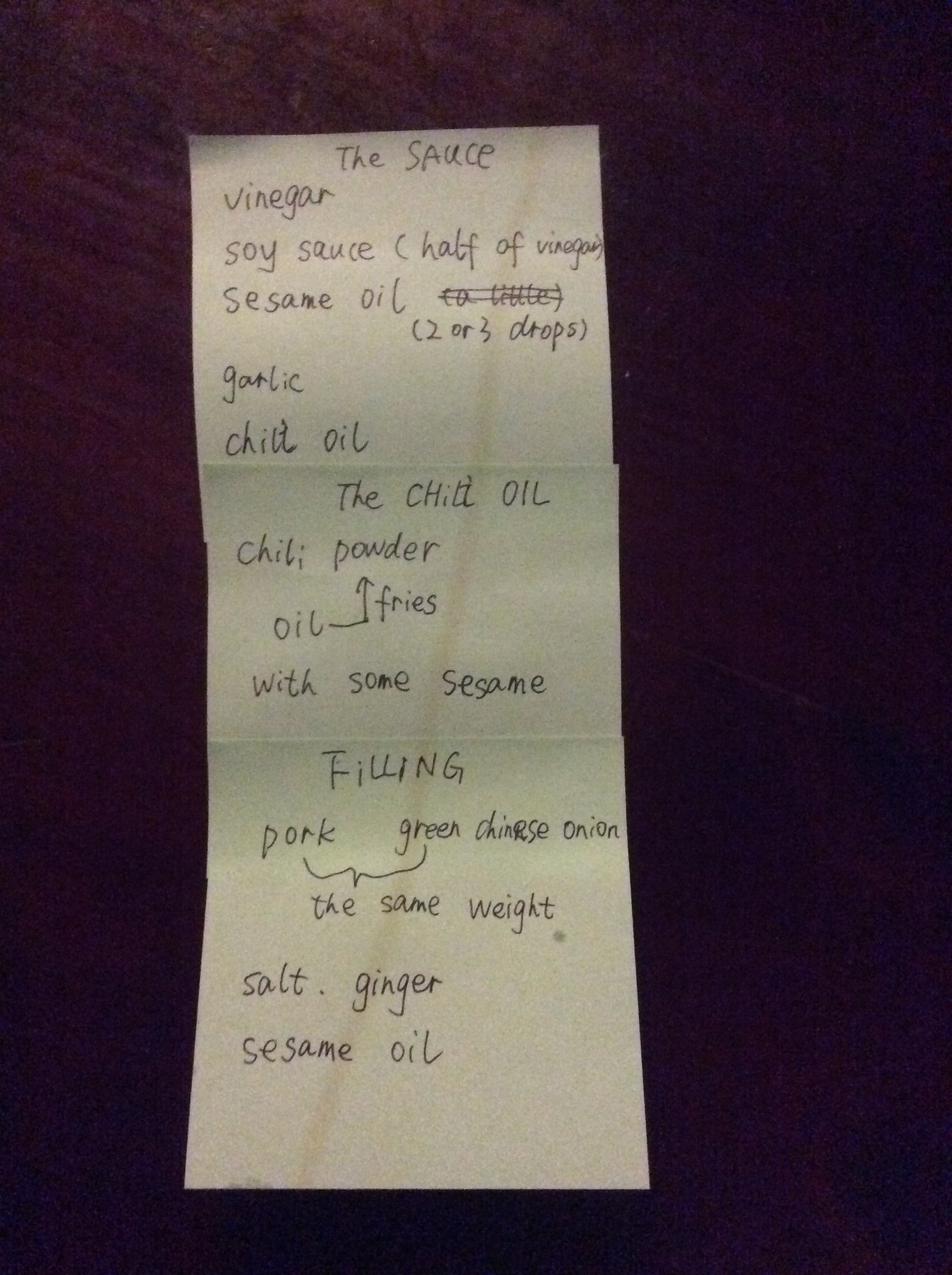 Once the dumplings were done, we could eat all we could handle. They were so delicious that I forgot to take a picture of the finished product! They also made a sauce to go with the dumplings, a somewhat spicy Sichuan style sauce that I am fairly certain we will never be able to replicate. I was able to get one of the girls to write down the ingredients so we could attempt to make these at home. She carefully translated the ingredients for us and left us with a crude recipe, so hopefully it will help guide us in the right direction when we try to make it at home!