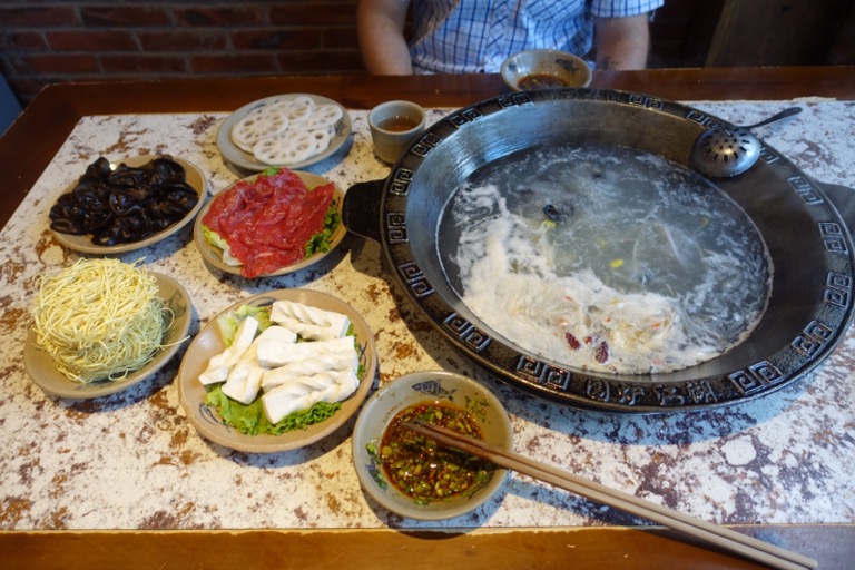 We found a hot pot restaurant for dinner, with a single handwritten English menu and a waitress that spoke a few words of English. We were able to make our own dipping sauce from an assortment of sauces and condiments including soy sauce, oyster or hoisin sauce (not 100% sure which), cilantro, green onions, Sichuan peppers, hot oil, red pepper powder, and black pepper. We ordered beef, tofu, cabbage – but we got lotus root, mushrooms, and noodles for the pot and got started. The tofu was really delicious, I am not sure what they do differently to the tofu here but it actually tastes really good and has a bit of a cheese like texture. Everything else was equally good, especially the quick-cooked beef strips 🙂 We probably spent 2 hours eating; even though this doesn’t look like a ridiculous amount of food, it took us forever to cook it all in the hot pot and eat it, and we were pretty full when we were done.