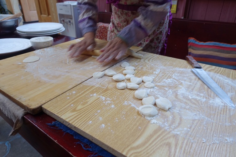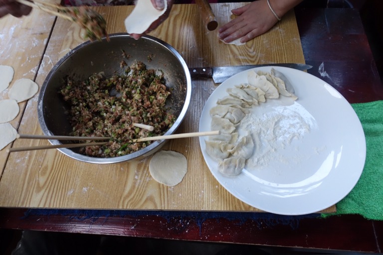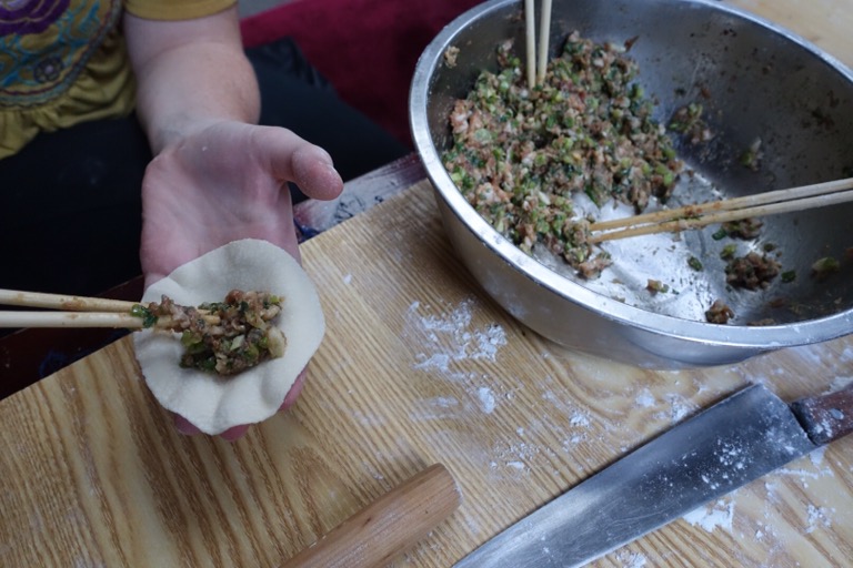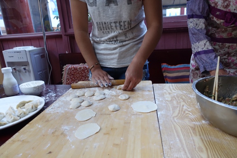One of the girls working at the hostel was from Northern China, where dumplings are more popular, and she showed us the proper way to roll the dough – roll the sides more than the middle, so the middle remains thicker than the sides and doesn’t come apart during steaming. You basically hold the middle and use the edge of the rolling pin to roll the sides of the circle outward.