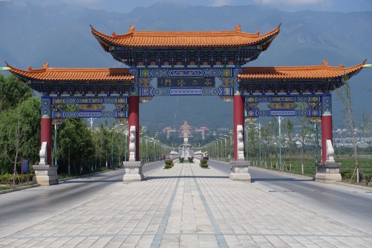 In Dali, we also took a day to ride bikes along the large lake near town. We got some crappy bikes from the hostel for 15 yuan each (about $2.50) and rode nearly 55 km in one day! We saw many pretty things along the way, including this nice archway that perfectly frames the Three Pagodas, a religious monument in Dali that we didn’t end up going to.