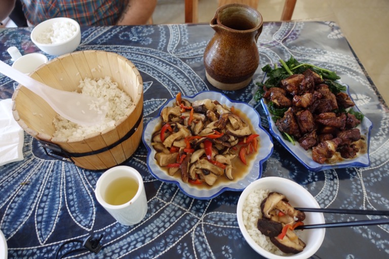 We stopped for lunch at a restaurant in the village we never thought we would make it to 🙂 They barely spoke English but were very nice, so we pointed at things in their fridge and they cooked them for us. We pointed to mushrooms and some sort of beef-like meat bits, and we got these two delicious meals. The meat bits were cooked with mint leaves and a soy sauce-based sauce – the mint leaves were delicious, something I never would have thought about cooking with meat! The mushrooms were also very good – simple, cooked with peppers. We never thought we would get such a delicious meal out of pointing at things in the fridge but it worked for us. Another group of travellers came in while we were eating and seemed to be having a much harder time ordering food – they were insistent on getting a plate of mixed veggies, which is not really how veggies are cooked here, and the entire kitchen staff had to come out to try to figure out what to do for them. Should have just gone with the flow!