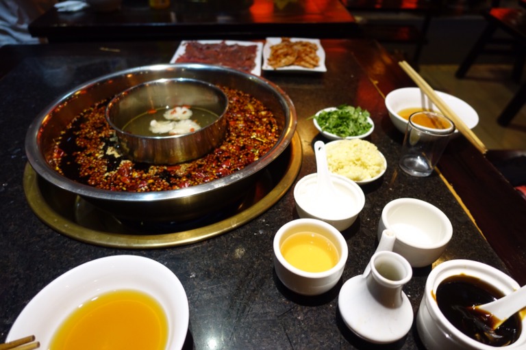 For dinner, we tried the Sichuan hot pot. O boy, was this an experience. It was a busy restaurant with one handwritten menu in English, so luckily we were able to order relatively easily. We got the two part hot pot with spicy Sichuan “broth” on the outside and a non-spicy broth on the inside. I say Sichuan “broth” because we are pretty sure it was mostly oil, with a massive amount of hot and Sichuan peppers in it.