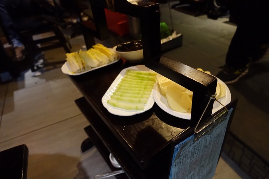 We also got some veggies – Chinese cabbage, winter melon, mushrooms, and potato, as well as beef strips and chicken wings. As for the dipping sauce, we were given a bowl with a cup of sesame oil in it, and the waitress pointed to the other ingredients on the table and guestured to us that we would mix it to make a sauce. Not too weird as we had done this before, but we didn’t have an empty bowl – we were supposed to make our sauce with a whole cup of oil as the base, and add in oyster sauce, vinegar, cilantro, and garlic.