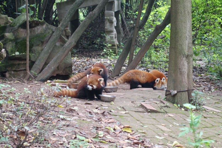 There are both giant pandas and red pandas here. The red pandas are much smaller than the giant pandas, perhaps 2ft tall.