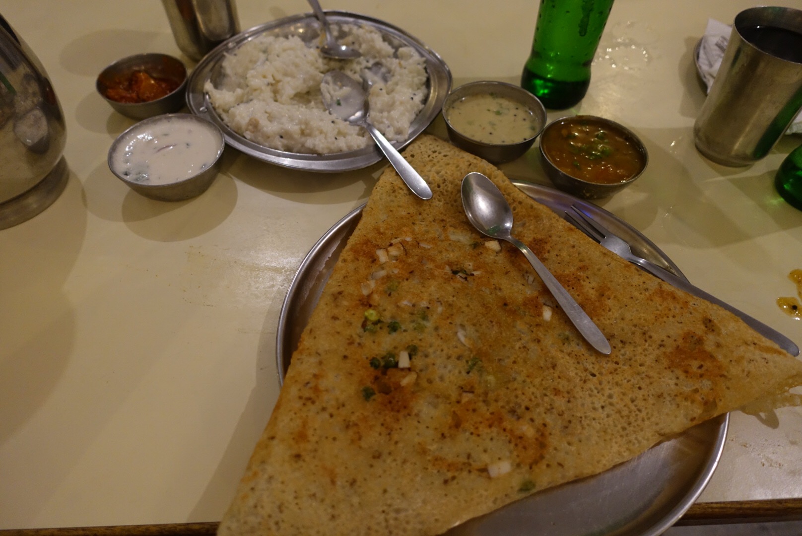 Varanasi was probably our favorite town in India. We arrived in the morning after a reasonably comfortable ride on the night train from Kolkata, and had some time to kill before we could check into our room at Stops Hostel. The nearby Kerala Cafe was recommended by the hostel staff, so we headed over for an early lunch. It was our first (and definitely not last) dosa of the trip, a tasty fried bread-like shell filled with potato and onion, with several dipping sauces. We also had a yogurt sauce rice that was kind of weird but Thom liked it.