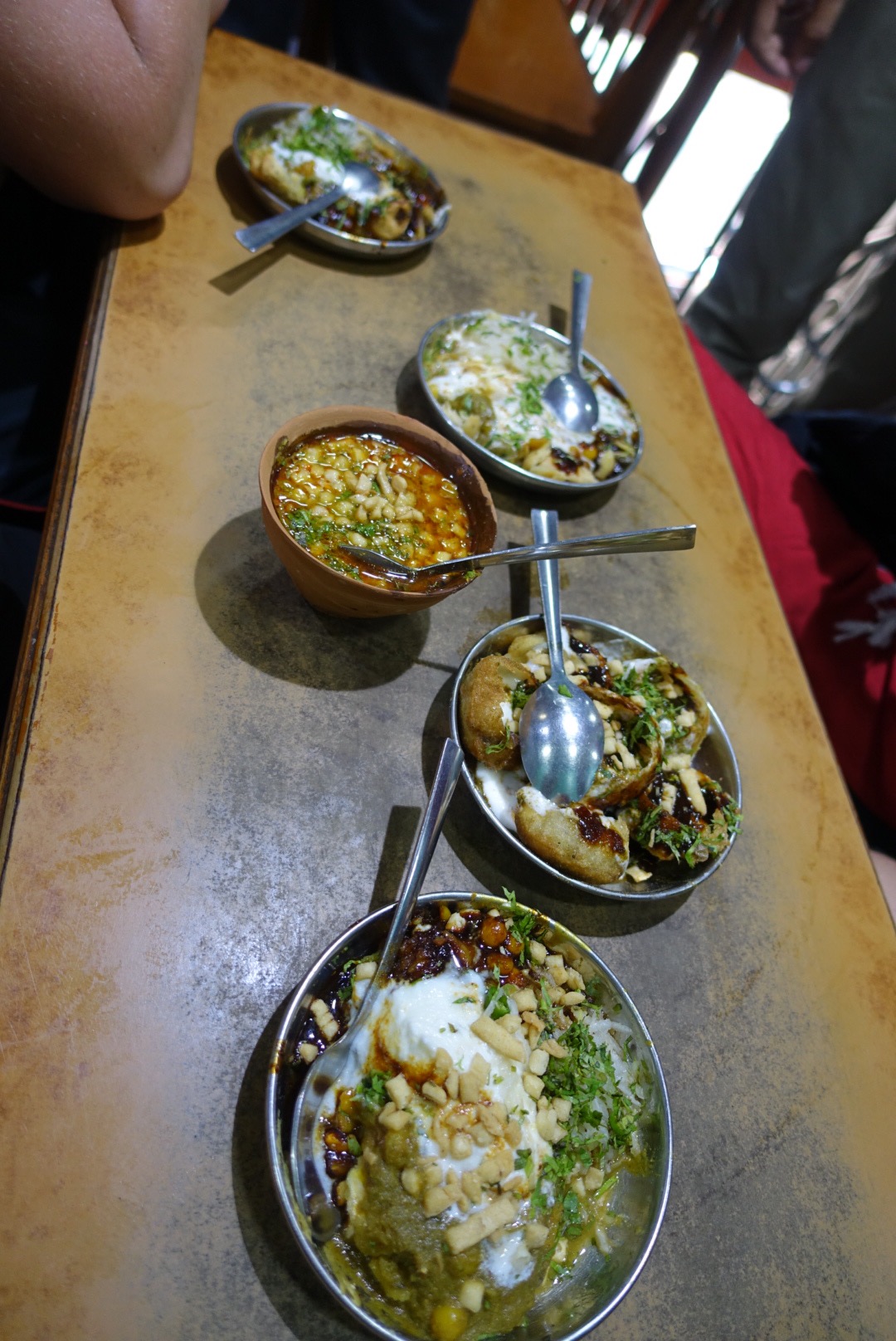 On the food tour, we met our fellow tour mates and walked to the first restaurant. It was still quite hot, but the food at the first shop more than made up for it. It was a chaat shop – chaat is a type of Indian snack, typically eaten in the late afternoon. We had 5 types of chaat – one with a chickpea cake, one with chopped up samosa, a tomato/bean soup-like one, and two others. I’m not sure I can really even describe what is happening here – each one has a bit of yogurt, a sweet brown sauce (maybe a type of chutney?), cilantro, nuts, a bit of mild onion, and probably more ingredients on top of the main ingredient – the samosa or chickpea cake, or whatever. Whatever they did, it was really amazing to eat – so many good flavors that worked together perfectly.
