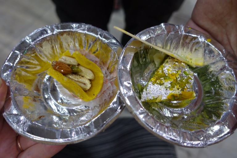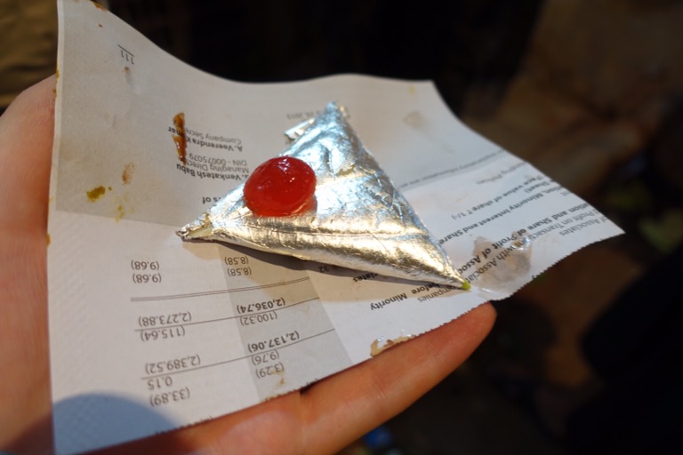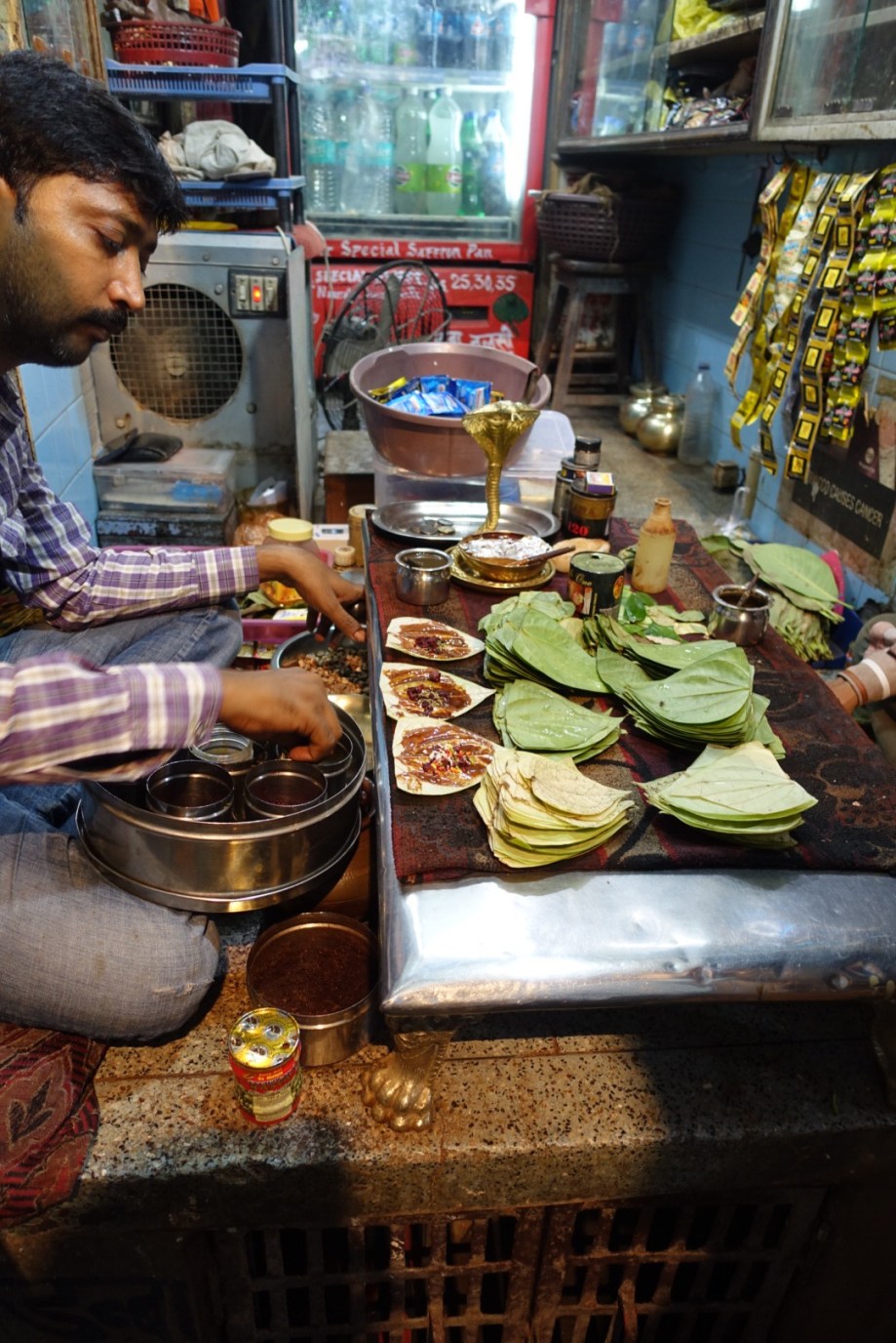 Lastly, we had a sweet paan. It is essentially a packet of bits of spice and small sweets that settles the stomach and freshens the breath, wrapped in a betel leaf. It is similar to the chew stuff they use in Myanmar, but this one was sweet, without tobacco or the stimulating betel nut. It was weird to chew but tasty, and we are glad to have tried it.