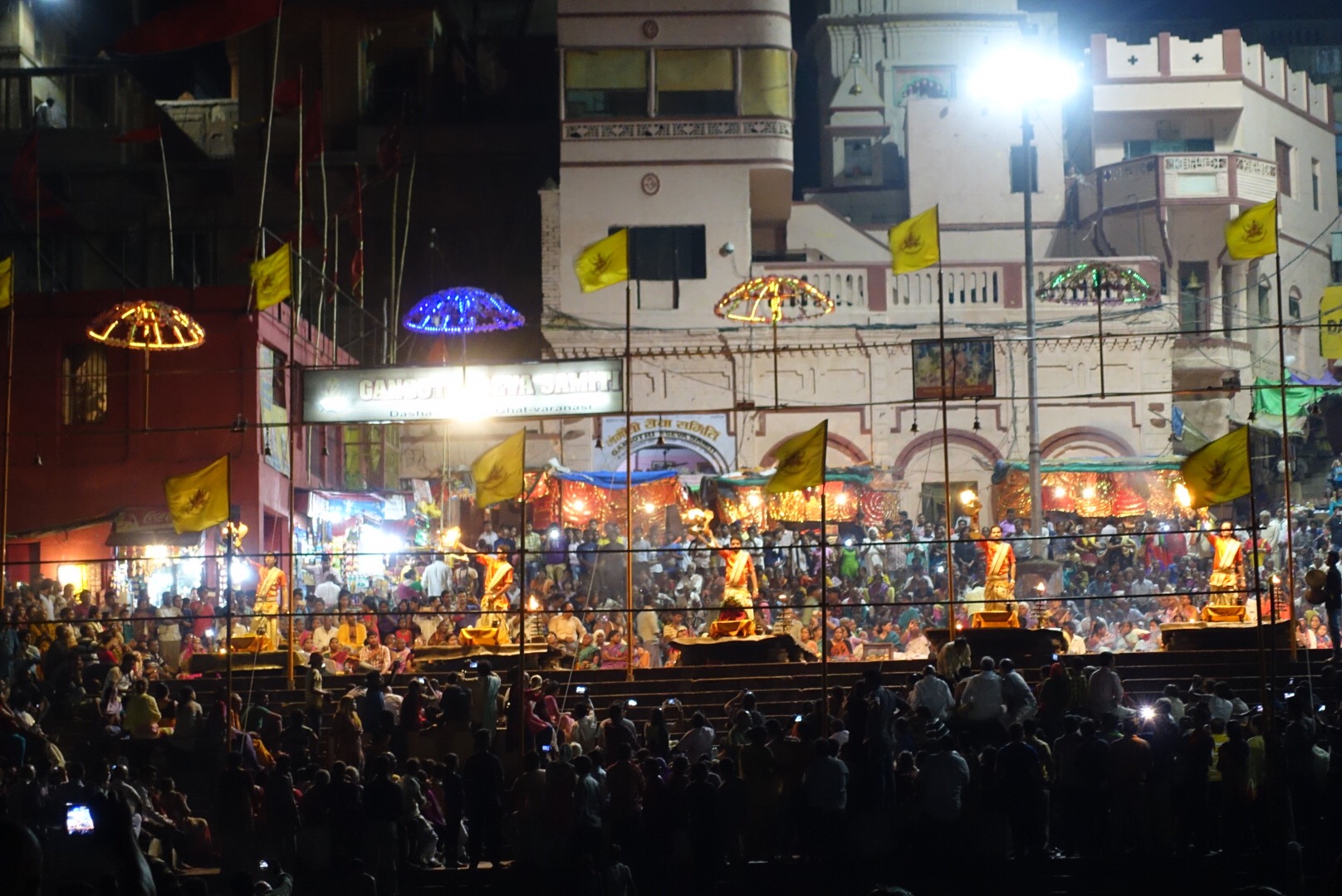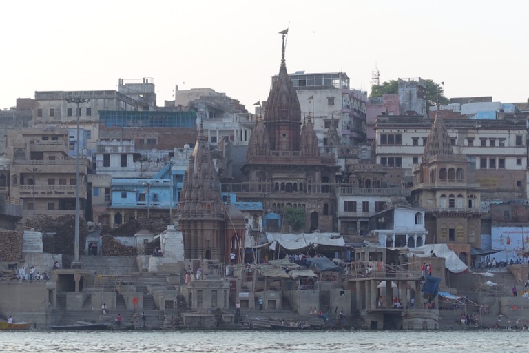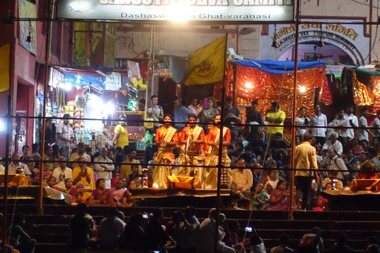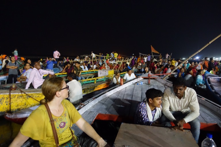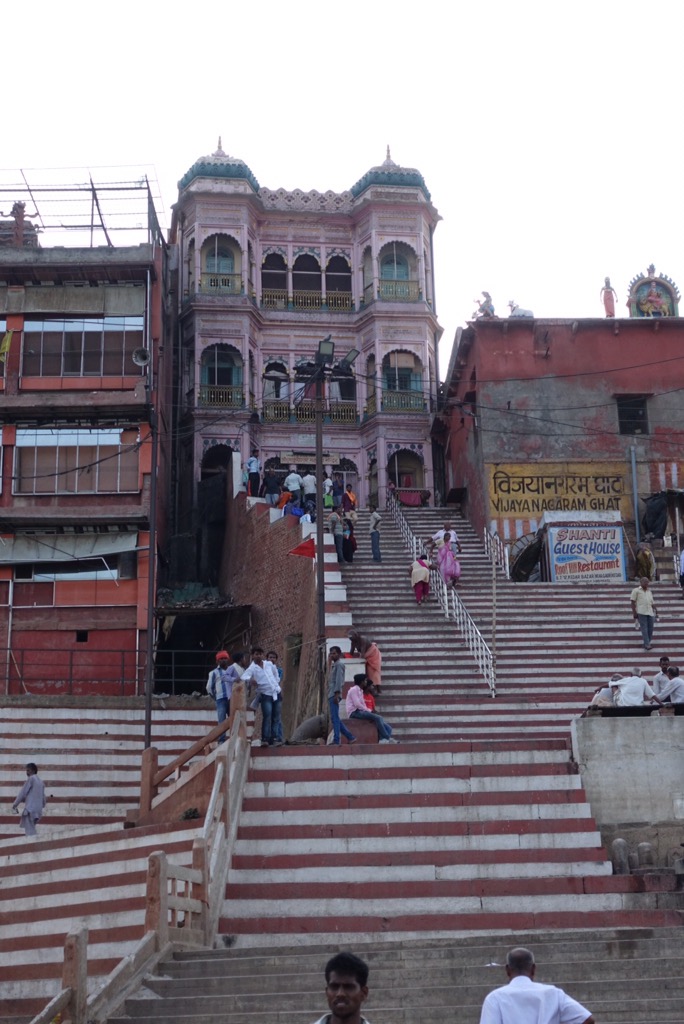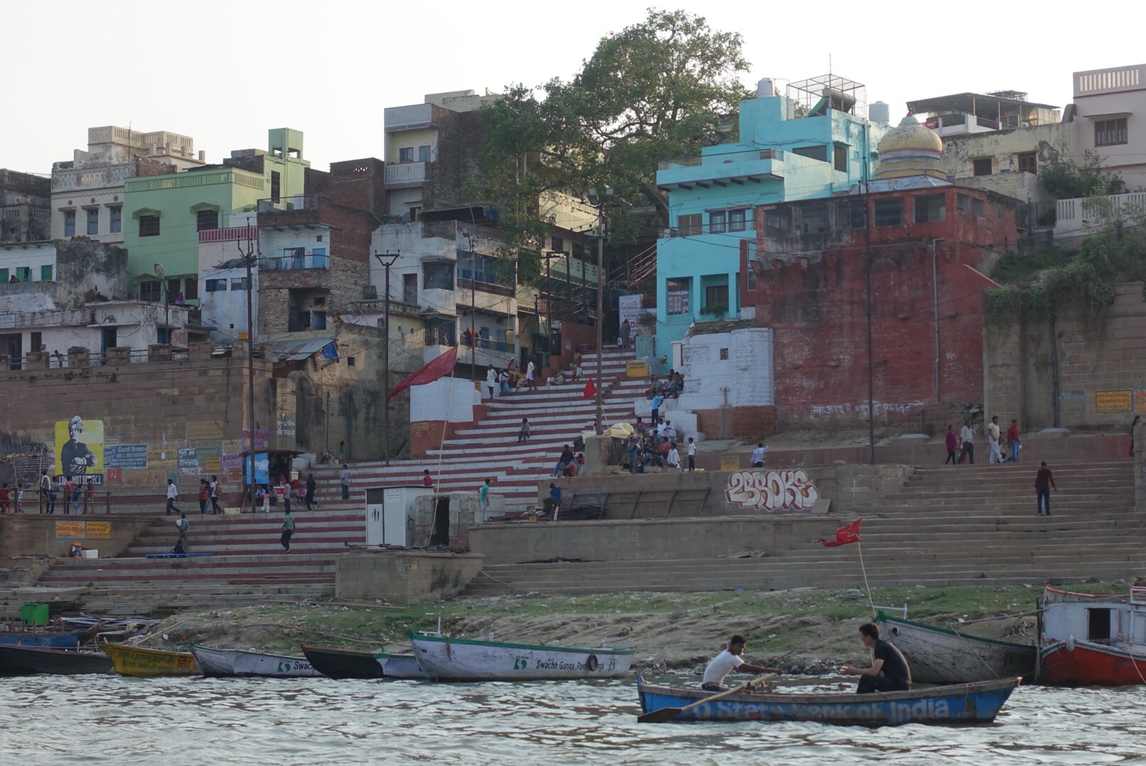We napped the afternoon away, in preparation for the ghats tour we were doing that evening. Varanasi is a holy city in Hinduism, and is set along the river Ganges. A dip in the Ganges washes away sins, and to die and be cremated on the banks of the Ganges in Varanasi allows a person to achieve nirvana and escape the cycle of death and rebirth. The ghats are stairways that lead to the river, and certain ones are associated with different activities. The cremation ghats were important ones to see, and this tour would take us there by boat, and end up at a big ceremony they do daily with prayers to Shiva and the Ganges.